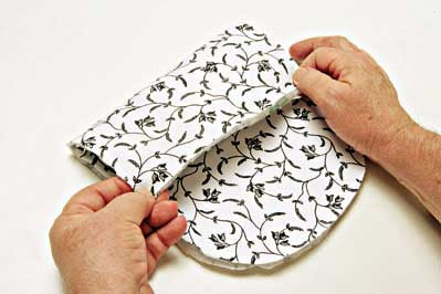 Agora dobre a peça no sentido do lado maior. Forme a bolsa, deixando duas partes do mesmo tamanho e a ponta arredondada por cima.